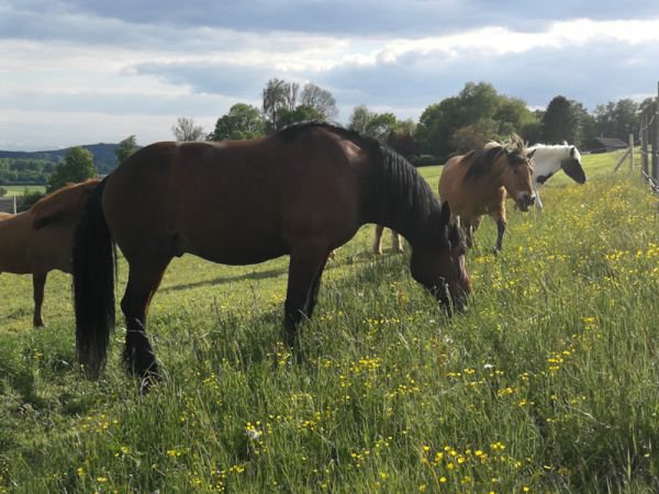 Grüzi wohl, ich bin der Hiro, ein Freiberger, sogar ein echter Schweizer und das jüngste Pferd am Hof. Aber mit meinen fast 1,70 m Stockmaß bestimmt nicht das kleinste. Ich stecke meine Nase gerne überall rein, denn ich bin seeehr neugierig und finde alles toll! Außerdem bin ich stets motiviert und lebensfroh. Ob Bogenschießen, Ausreiten oder Voltigieren, ich bin immer gerne mit dabei. Ein Held bin ich auch, obwohl man Hero eigentlich mit e schreibt, aber wen interessierts? Denn ich bin mutig und trotz meines jungen Alters kannst du dich auf mich verlassen. Mein Erkennungsmerkmal ist mein einzigartiger weißer Fleck an meiner linken Seite und meine 3 weißen Socken (die vierte hab ich verloren).